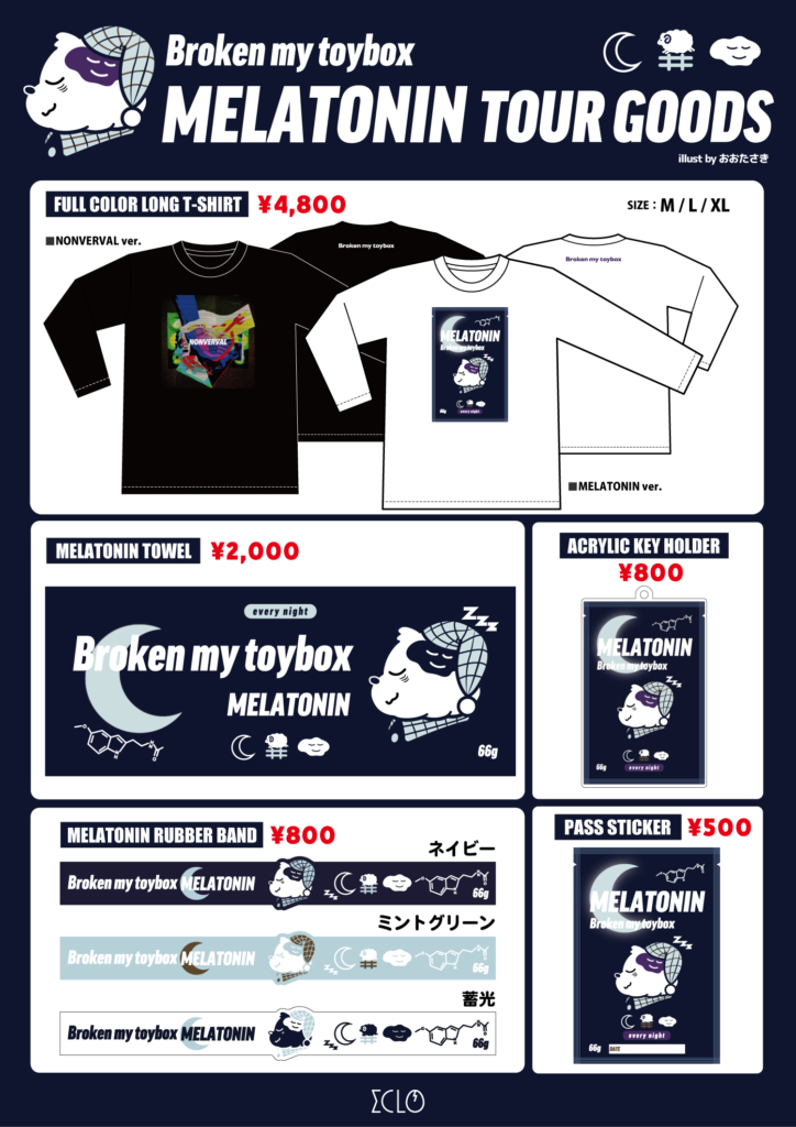 12/27(土)梅田BANGBOO公演から発売します!ぜひ手に入れてください!・フルカラーロングTシャツ ¥4,800type:NONVERVAL ver. / MELATONIN ver. size:M / L / XL・メラトニンタオル ¥2,000