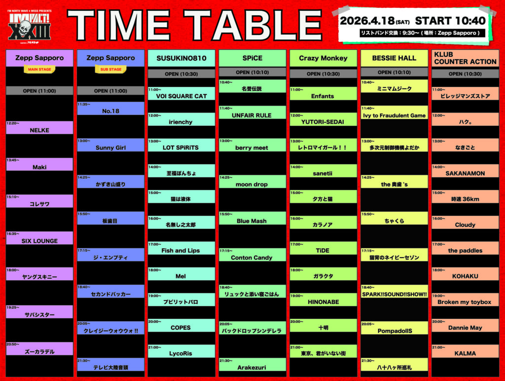 ■チケットURL:https://w.pia.jp/t/impact/リストバンド交換 10:00〜※リストバンド交換場所:Zepp Sapporo(予定)